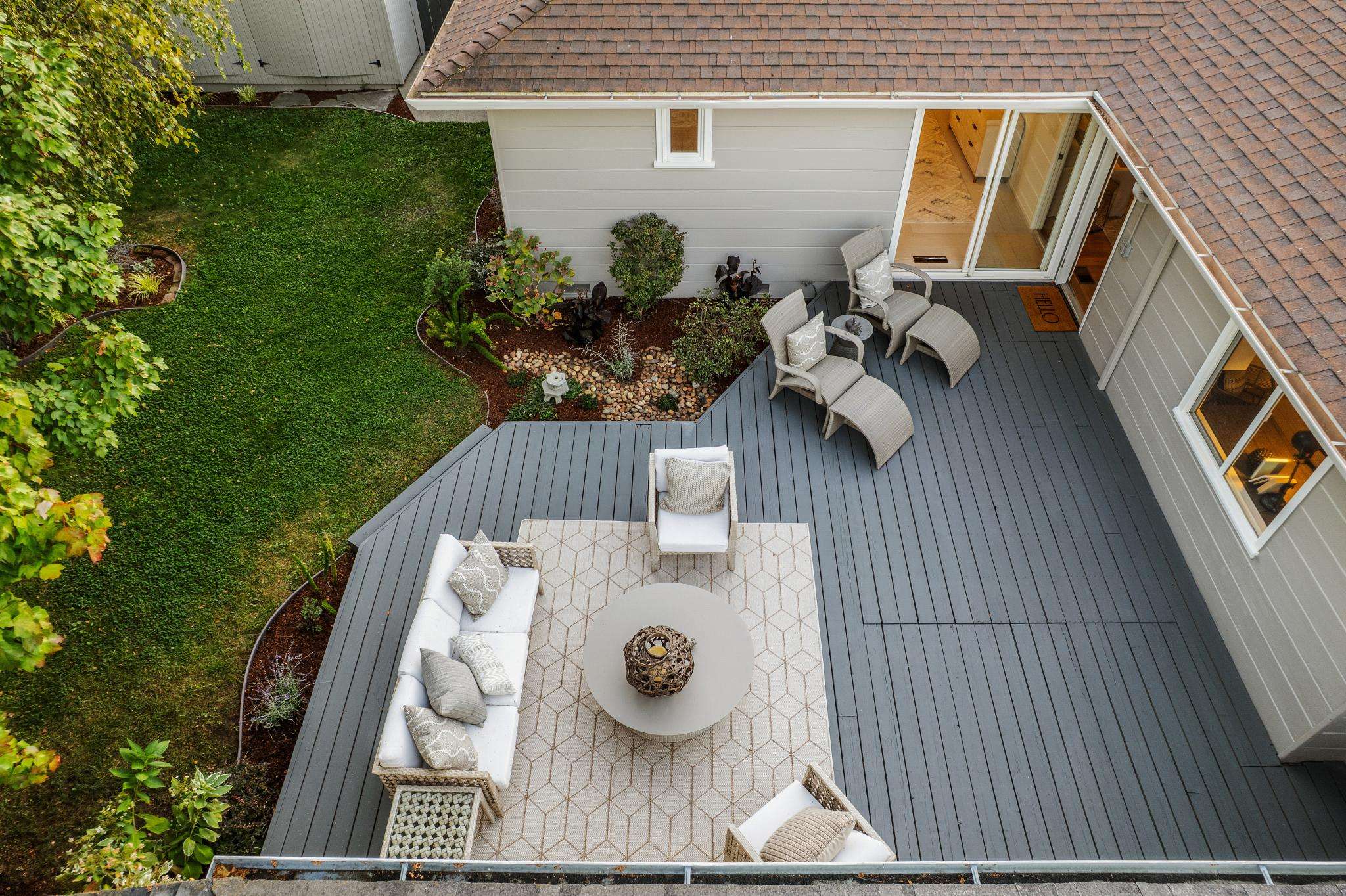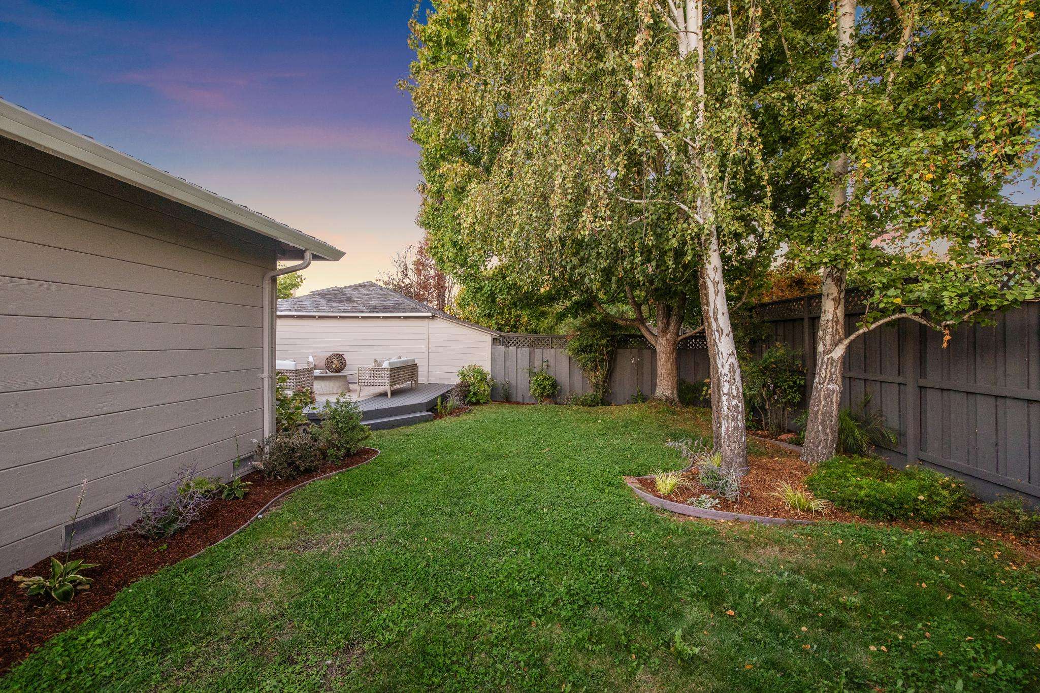 - Well-kept grounds include an emerald front lawn with perimeter flower beds, a side yard atrium with new perimeter plantings, and private backyard with a deck, lush lawn, mature leafy trees, freshly spruced-up flower beds, new fencing and a large storage shed