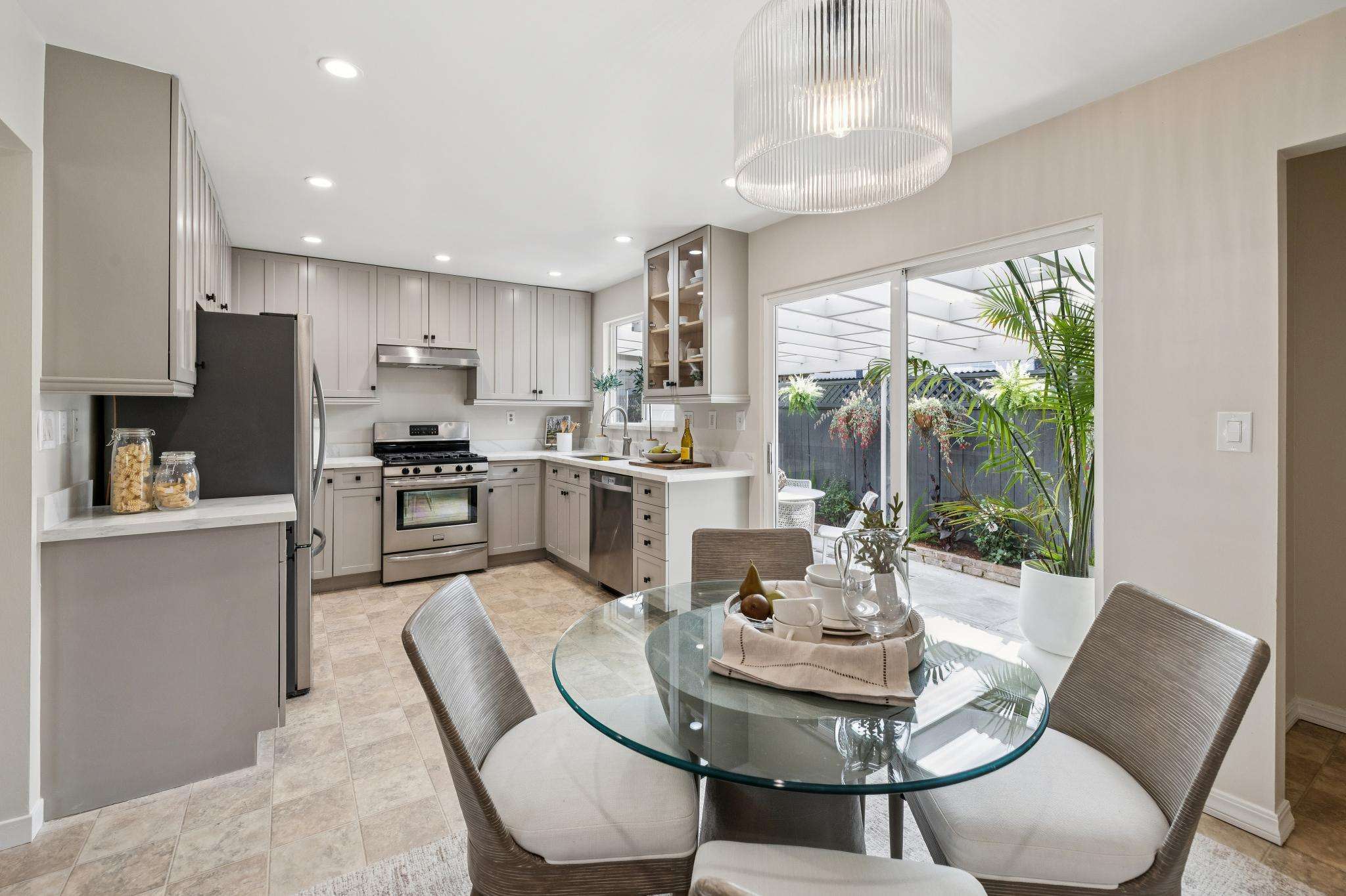 - New Quartzite counters and backsplashes add panache to the kitchen with newly painted cabinets and stainless steel appliances and fixtures, including a refrigerator, gas range, dishwasher, microwave, and dual-basin sink; eat-in area with built-in cabinets is near the sliding glass door to the atrium — a ‘protected’ outdoor living space shared with the family room