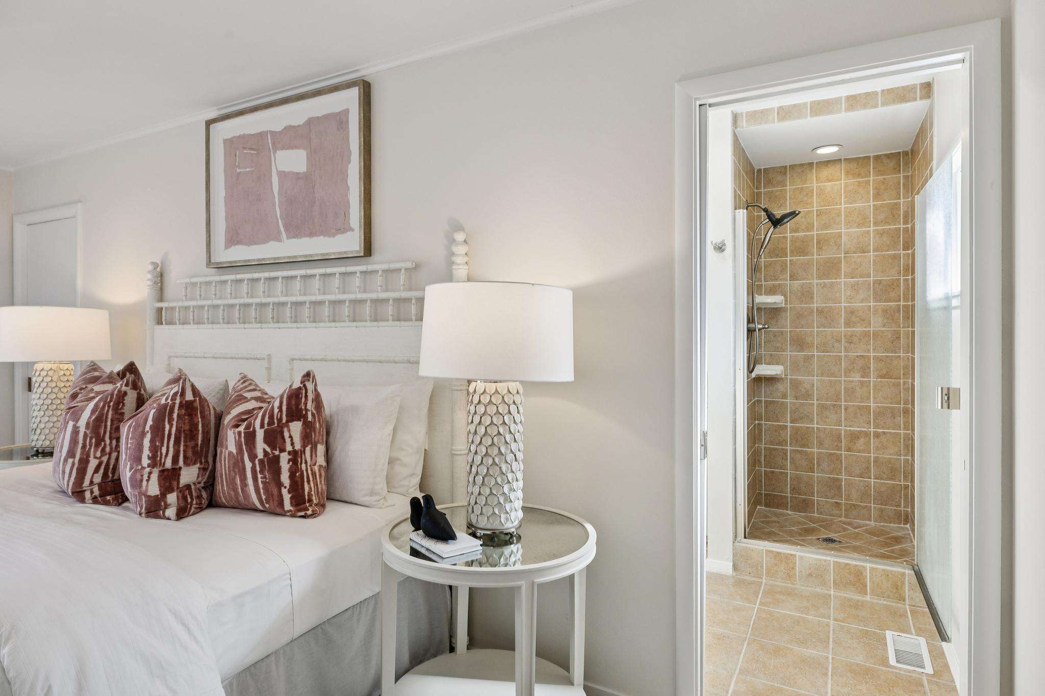 - Newly carpeted primary bedroom has a cedar-lined walk-in closet with wire shelves, tiled en suite bathroom with a step-in shower and granite-topped vanity and sliding glass door to a tranquil back yard setting